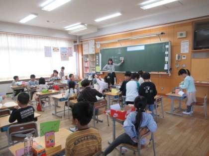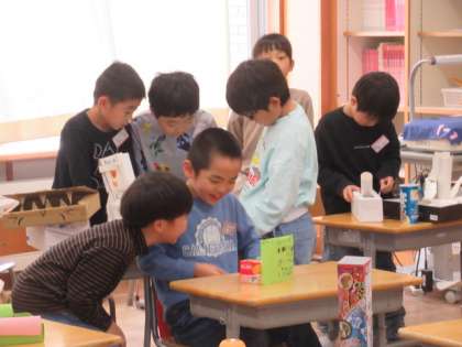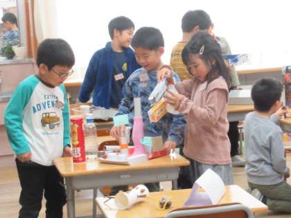 友達のつくったおもちゃで遊びました。いろいろな工夫がされており、楽しいです。つくった子供たちもとてもうれしそうです。