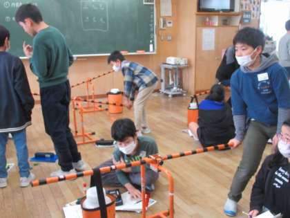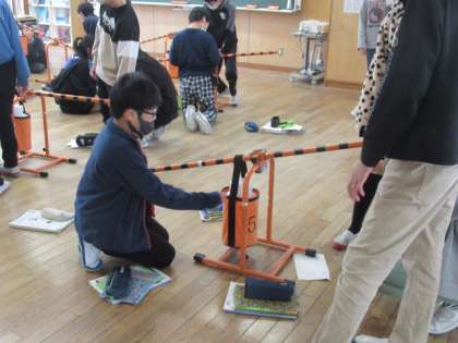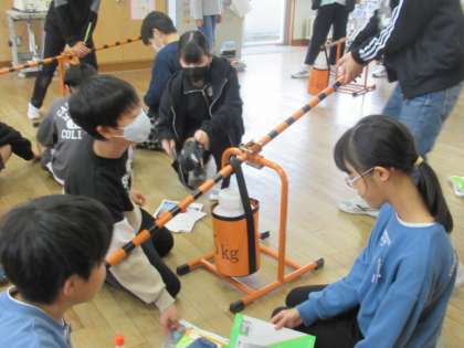 てこを使って重いものを持ち上げます。おもりの位置をどこにすれば楽に持ち上がるのか、いろいろと工夫していきました。