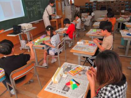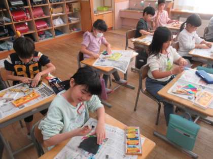 紙に二層になるようにクレヨンを厚くぬります。その後、竹串や粘土ベラ、割り箸などでひっかいていくと、ハイカラな色合いの模様が浮き上がってきます。楽しく製作できました。