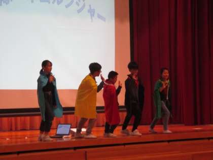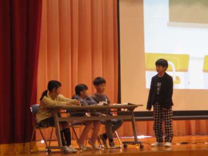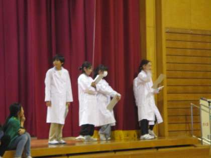 学校保健委員会で、保健委員会の子供達が睡眠の大切さを呼びかける劇をしました。5年生も委員会メンバーとしてクイズを出したり、大きな声で言ったりなど、全校に伝わるように発表を工夫していました。