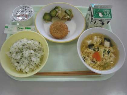 菜めし 牛乳 とやまミートコロッケ とろろ昆布和え かきたま汁 りんごヨーグルト
