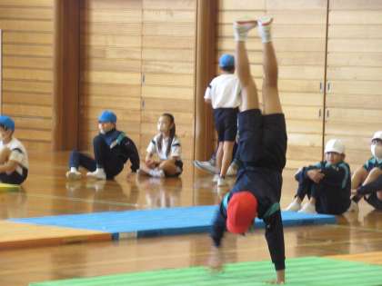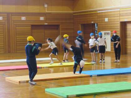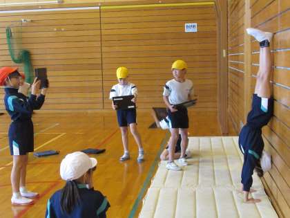 壁倒立で体全体が逆さまになることに慣れながら、倒立前転に取り組んでいます。また自分の表現をクロームブックでお互いに録画しています。自らの技を自分の目で確かめることにも役立っています。