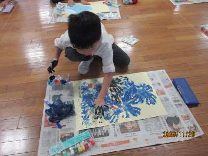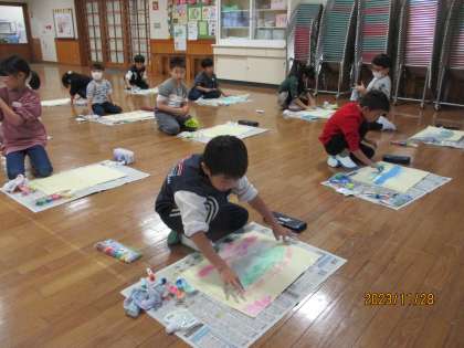 液体粘土のとろとろした触感を楽しみながら、思い思いの絵を描きました。手のひらをダイナミックに使ったり、指で点をたくさん描いたり・・・子供たちの自由な発想が光ります。