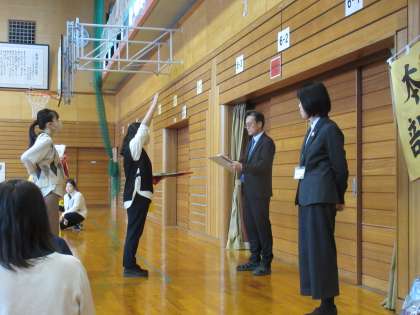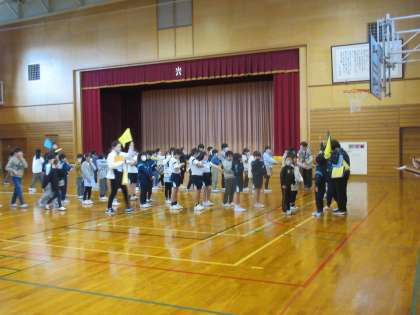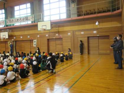 今日は、給食室から出火したという想定で体育館へ避難しました。消防署の方からは、「お・は・し・も」を守って避難できていたことを褒めていただきました。
