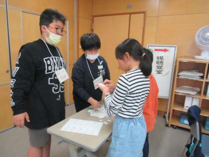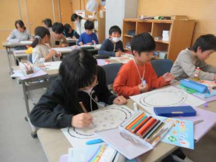 お店でいろいろな野菜やソーセージなどのお買い物をして、オリジナルピザをつくります。お店役、お客役を交代しながらお買い物を整え、最後にはピザの生地の絵に貼って、色塗りをして仕上げました。おいしそうなピザになりましたよ。