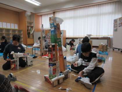 作品がどんどん進化しています。子供たちの身長ほどの高さのものもあります。楽しく製作中です。