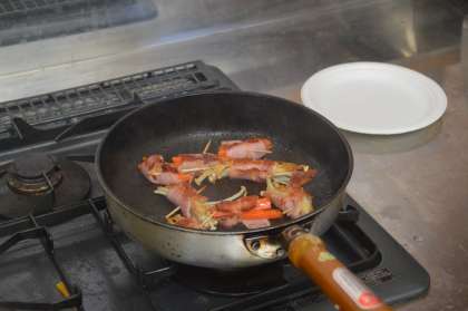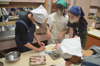 調理計画を基に「野菜のベーコン巻き」を作りました!子供たちは、ただ調理するだけでなく、節水といった環境にも配慮することができました!