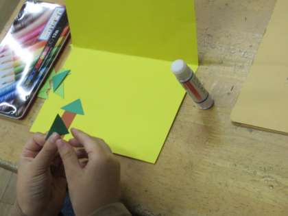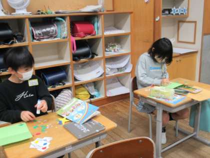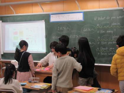 手に入れたパーツを貼って、カードを仕上げます。できたら、友達と紹介し合います。パーツを手に入れるときは、英語でやりとりをします。かわいいカードが出来上がってきています。