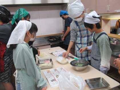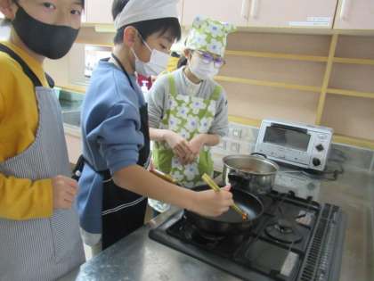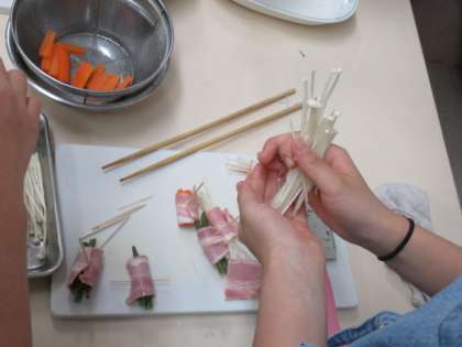 家庭科では調理実習に取り組んでいます。つくるのは、「野菜のベーコン巻き」です。いい感じにでき上がってきています。