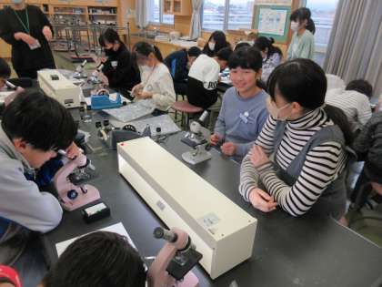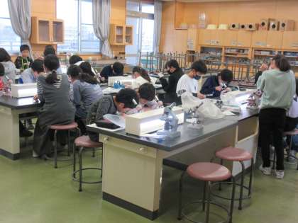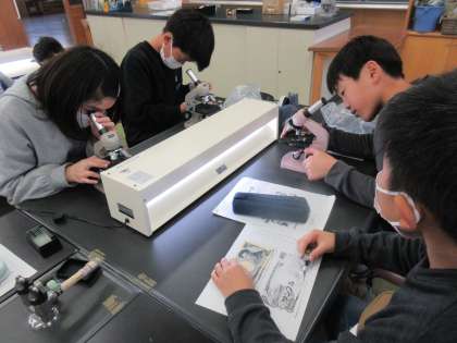 科学実験クラブでは、顕微鏡を使って髪の毛やお札の柄等を観察しました。みんな興味津々で「先生、見て見て!」「すごい!」等と声をあげながら、夢中になってレンズをのぞき込んでいました。