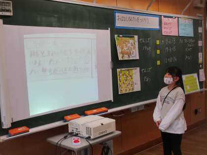 算数の学習で、絵を見てお話問題をつくり、友達と問題を出し合いました。たし算言葉、ひき算言葉に注意しながら、一人一人、真剣に問題を考えていました。