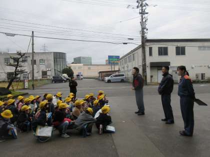 今泉にある富山市消防局富山消防署へ見学に行き、クラス毎に署内見学、車両見学、水消火器体験を行いました。
