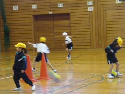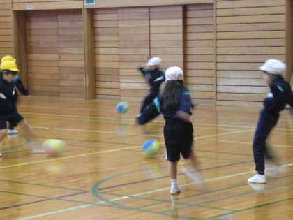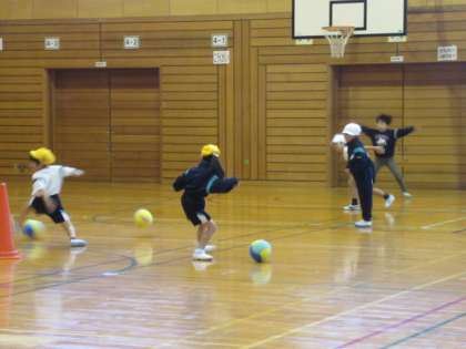 ボールを蹴る運動をしました。寒さが厳しくなってきましたので、長袖・長ズボンの体育服で参加する子供が多くなってきています。