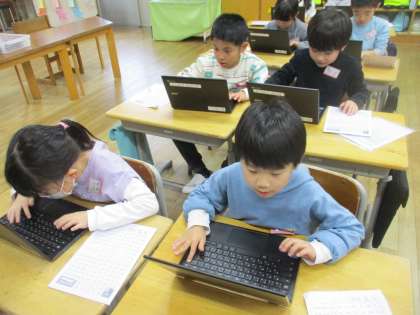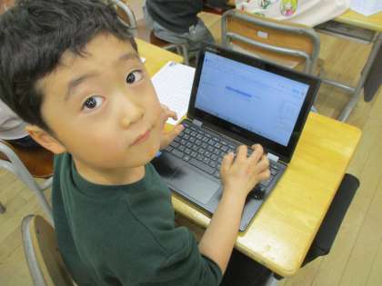 クロームブックにも慣れてきました。ローマ字の表を見ながら、自分の名前を入力する練習をしています。真剣な表情です。