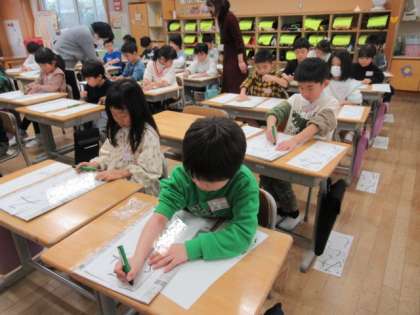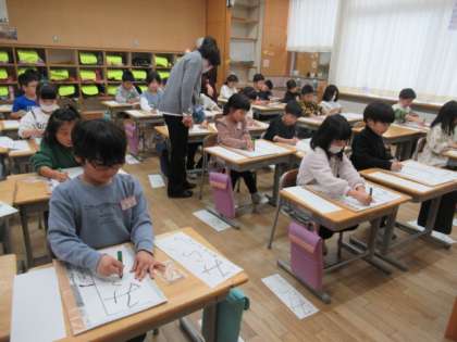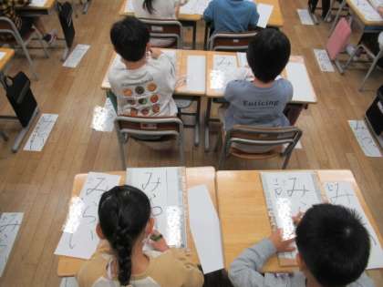 背筋はピン!足はぺったん。よい姿勢で書いています。