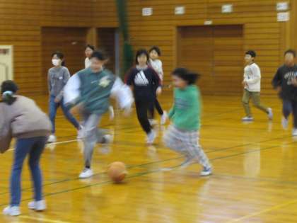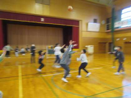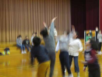 学期末の集会では、スポーツをして楽しみました。ゲームには先生も参加。「2学期もお疲れ様でした」という思いを共有して、楽しい時間となりました。