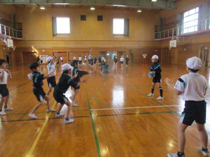 体育科の学習では、セストボールに取り組んでいます。パスをつないだりドリブルで突破したりしながら、ゴールを目指します。