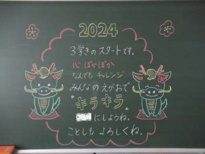 今日から新学期です。教室の黒板には、担任の先生から子供たちへのメッセージが書かれています。3学期は、一年のまとめをする時期です。共に成長を実感し合うことができるようがんばっていきましょうね。