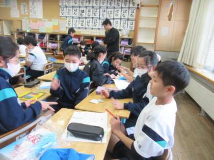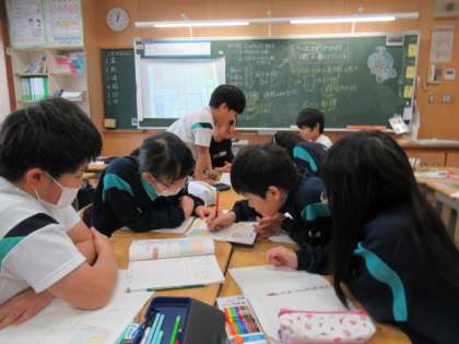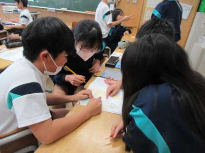 ゲーム形式でグループで楽しく考えました。辺を合わせて重ねる、同じ物で比較する、他、子供たちは確かめ方を工夫して、追究を進めています。