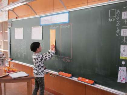 算数の学習で、10のまとまりごとに数を数え、十の位と一の位に分けて、算数ブロックを動かす練習をしました。大きな数も、10のまとまりごとに数えると簡単だということに気付くことができました。