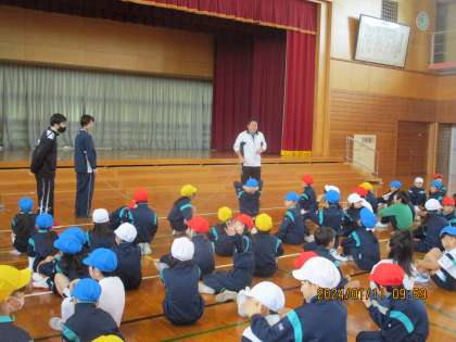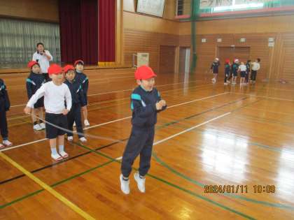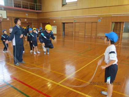 体育科の学習では、大縄跳びの練習をしています。タイミングが難しいですが、先生の声かけや友達の応援の力を借りて一生懸命練習していました。