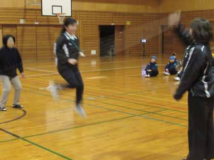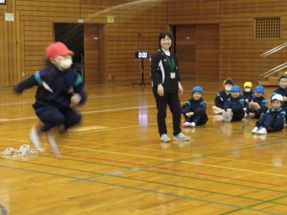 1年生も大縄に挑戦!回り続ける縄に入り、そして抜けることができるか。先生がまずお手本を見せ、チャレンジャーの子供たちもさっそくやってみました。よし、うまい!