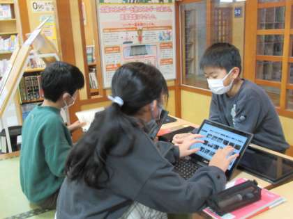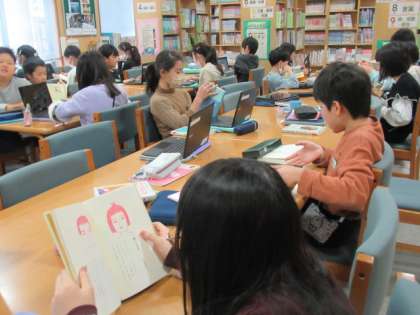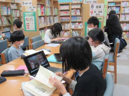 お気に入りの詩集を探すために、図書室で学習しています。いい詩がたくさん見付かったかな?