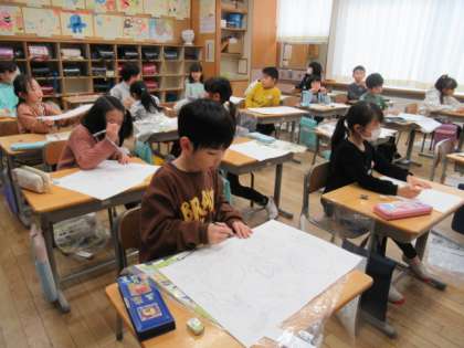 順番にコーナーに来て製作です。ローラーをダイナミックに動かして、迫力のある作品になりました。待っているときは、下描きをします。