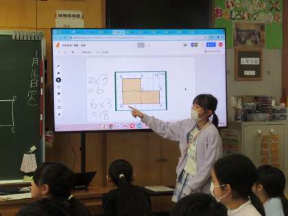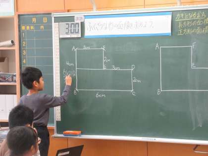 長方形が二つ複合したような複雑な形。この面積を求める方法を考えます。二つに分けて考えるか、大きなものから引いて考えるか、子供たちは工夫してそれぞれの考えを発表していきました。