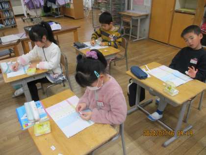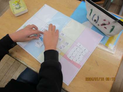 算数科では、4けたの数の学習をしています。カードや表を使って数の表し方を覚えます。