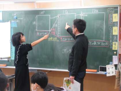 1辺が1mの正方形状の土地の面積、そして1辺が10m、さらに1辺が100mになったら面積はどうなるか、比較しながら考えていきました。