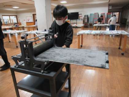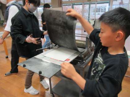 講師の先生に教えていただきながら、ドライポイントに挑戦しました。従来の黒のインクはよい持ち味を出しますが、茶色もなかなかいい雰囲気を表現してくれました。仕上がりに子供たちも満足げでした。