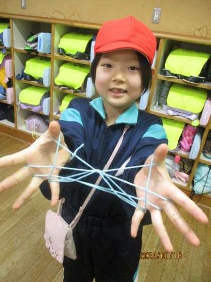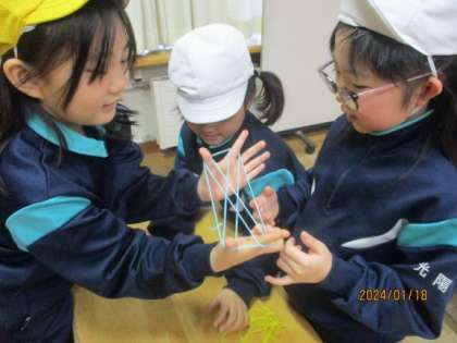 生活科では昔遊び名人を目指して練習しています。今日は、あやとりを練習しました。友達と一緒に練習したり、一人でいろいろな形を作ったりしました。