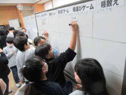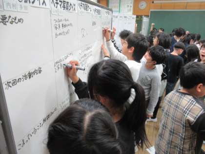 1・2学期に栽培と追究を続けてきたヘチマの研究成果をたくさんの人に伝えます。そのための準備を2クラス合同で進めています。これからは、互いの進捗状況を把握し合うために、ホワイトボードを活用していきます。さっそくいろいろな情報が書かれています。