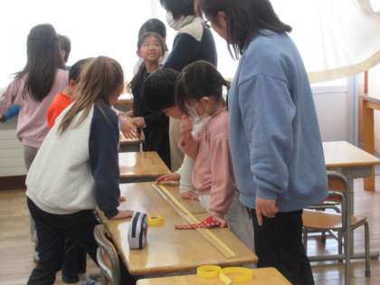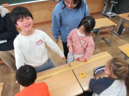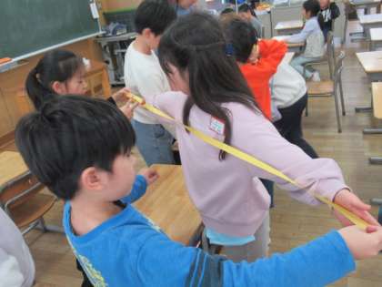長さを正確にはかるにはどうすればよいか?子供たちは紙テープや30cmものさしなどを使って試行錯誤しながら考えています。