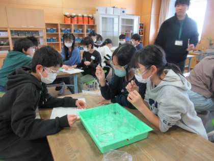 2色のリトマス紙を使って、水溶液について調べていきます。水溶液は5種類、それぞれの色の変化を確かめていきます。