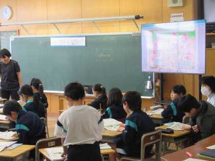 学校にはたくさんの教室があります。それらを英語ではどのように言うのか、また、その教室へ案内するためにどのように伝えればよいのか、実際の発声やポインティングゲーム等を通じて学びました。日常の学校生活でも、友達に英語で案内してみると楽しいかもしれませんね。