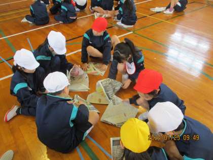 紙鉄砲を使ってボールを投げるフォームを確認しました。おうちでも新聞紙を使って挑戦してみてください!