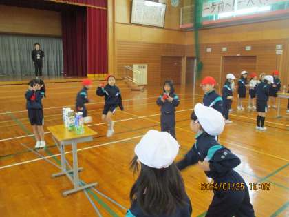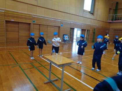 後半は、お手玉を使って的当てゲームをしました。狙いを定めて制限時間内に何本倒せるか・・・!みんなで協力して頑張りました。