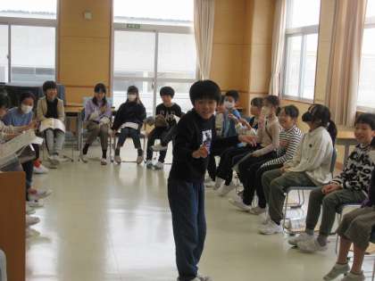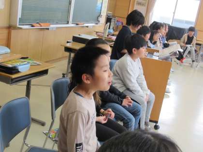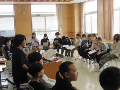 音楽科の学習では、みんな丸くなって向き合って歌っています。それによりお互いの歌い方、表情がとてもよく分かり、参考にし合うことができます。そして何より、向き合うということは、心も一つになるということです。それぞれの思いを共有し合い、その上で歌唱の技能の向上を目指していきます。