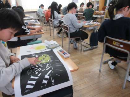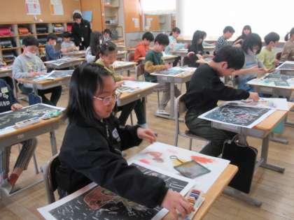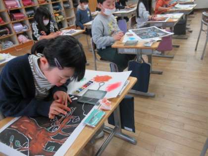刷り上がった版画に色を付けてカラフルに、かつ立体的に仕上げていきます。モノトーン調だった版がきれいになってきました。