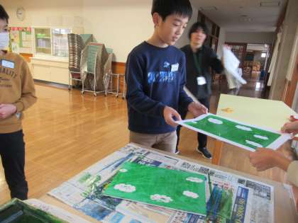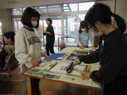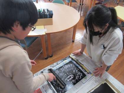両面彫りの版画もいよいよクライマックス。インクをのせて刷り上げます。ここからは、友達との協働作業です。互いの思いを尊重しながら作業することで、最後まで丁寧に仕上げていくことができます。どの友達とも息をぴったりと合わせられる子供たちです。そして、それが作品の仕上がりに反映されています。
