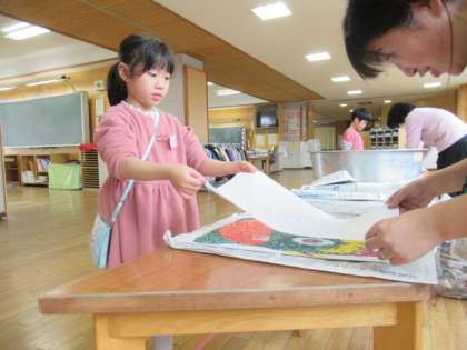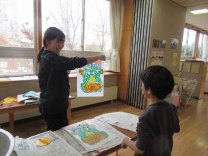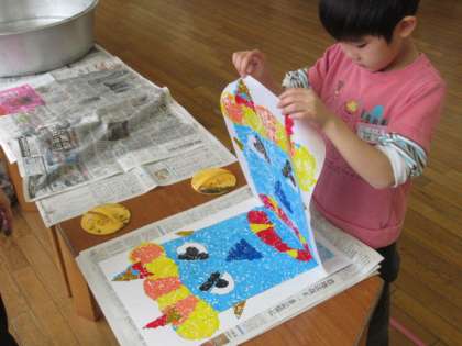 順番に行います。担当の先生と力を合わせて、ゆっくりと丁寧に。おー!きれいに刷り上がりました。