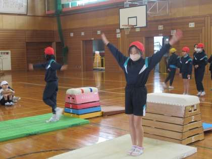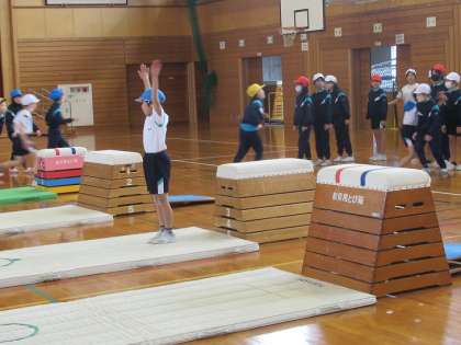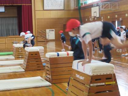 今日からしばらくの間、技アップ週間〜跳び箱運動編〜を実施します。今日は1回めということで、4年生の子供たちがセッティングしてくれました。また、体育科の時間でもさっそく行いました。跳び箱は、安全に扱わないと怪我につながります。はじめは跳び箱の扱い方について指導のお話を丁寧に聞き、残った時間に少しお試しの運動をしてみました。