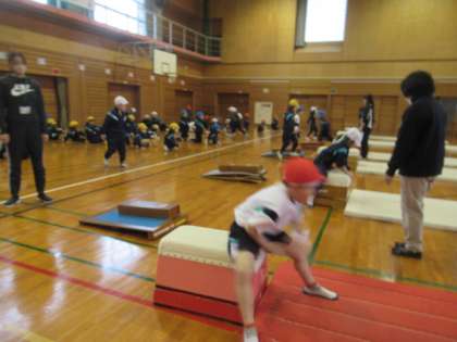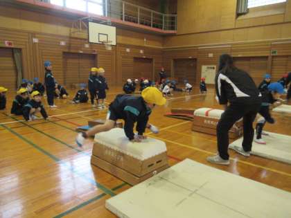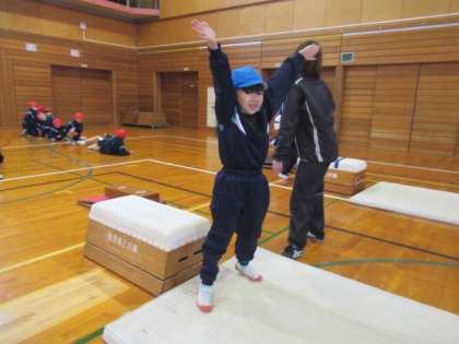 跳び箱にお尻をのせて、ジャンプ!そしてポーズ。スモールステップで学びながら、抵抗なく慣れ親しんでいきます。