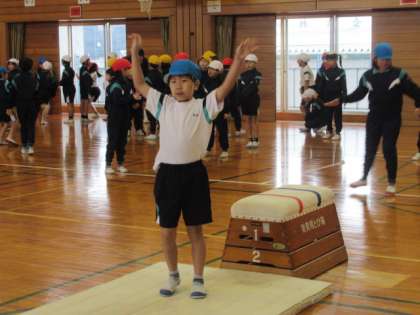 開脚跳びに挑戦中です。その導入として、両足踏み切りと両手つきを確実にできるようにしていきます。ポーズもかっこいい!