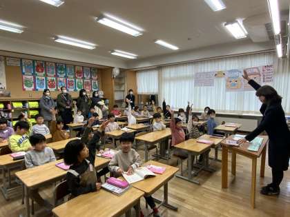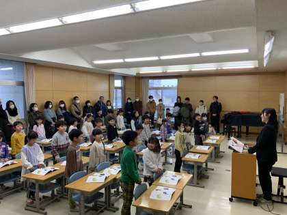 今年度最後の学習参観です。1組は国語科、2組は音楽科の学習を公開しています。