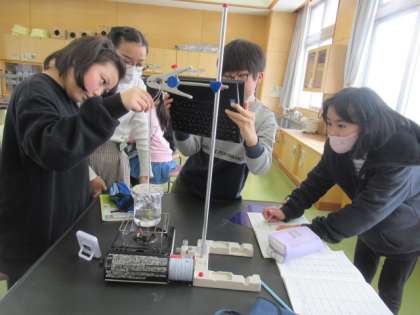 力を合わせて実験を行います。ビーカーや温度計の準備はもちろん、クロームブック、タイマーの分担もバッチリです。