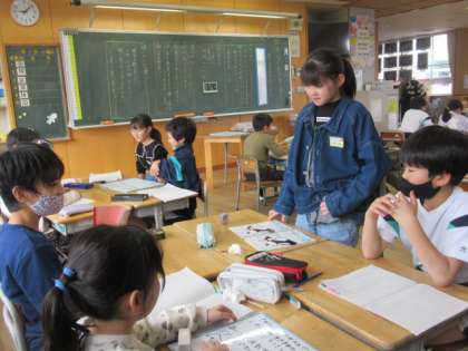 学校のよいところを伝えるためにグループで話し合い、一つ決めます。発表時間は3分間です。子供たちは熱く語り合っています。