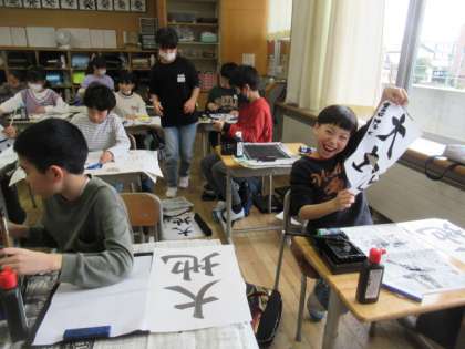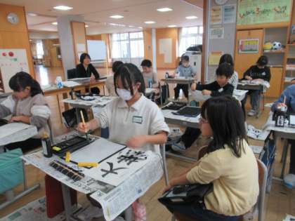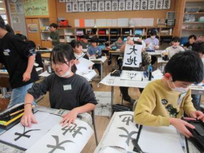 一年間のまとめとなる作品です。これまでの学習を振り返りながら、丁寧に筆を進めました。特に大地の「地」には、右上はらいがあります。なかなか思うような形にはならず、苦労する子供たちがたくさんいました。さて、次回は清書です。